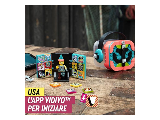 - Incoraggia i bambini a dirigere e interpretare i loro video musicali con LEGO® VIDIYO™ Punk Pirate BeatBox (43103). Il set include la minifigure di un pirata punk con chitarra, 14 BeatBits casuali e 2 BeatBits speciali.