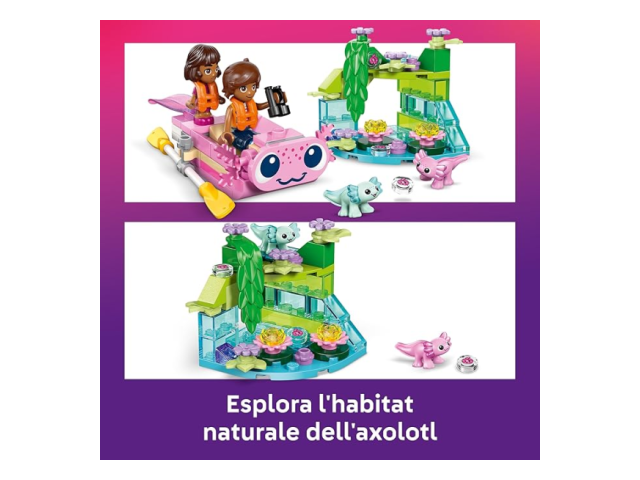 - SET DI COSTRUZIONE CON AXOLOTL: questa Barca d’avventura Axolotl LEGO® Friends (42681) per bambini include una mini-barca, 2 personaggi e 2 mini-axolotl giocattolo, per tante attività di gioco divertenti per i bambini e le bambine dai 5 anni in su