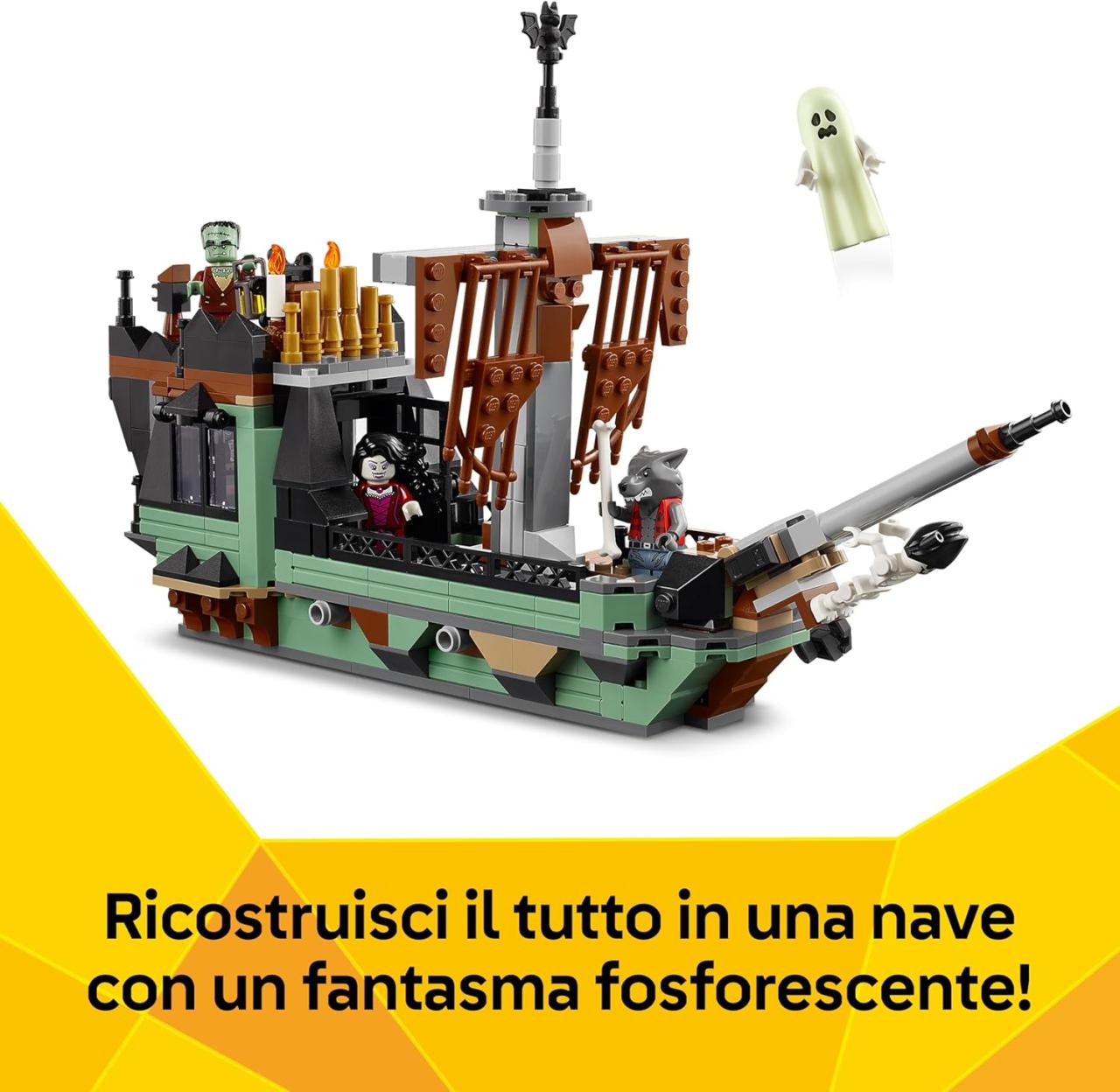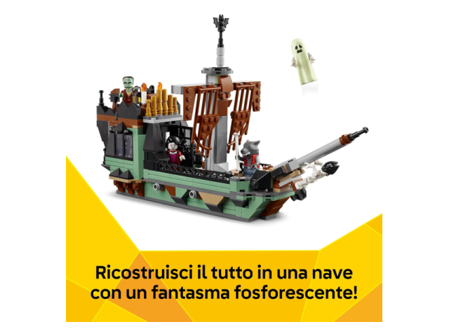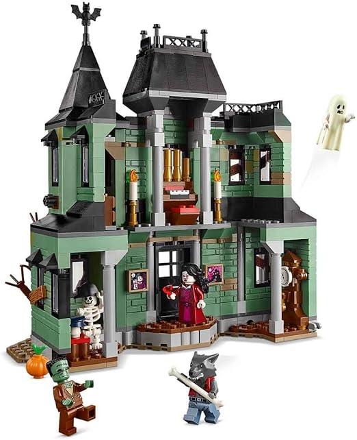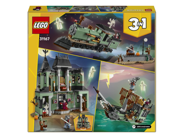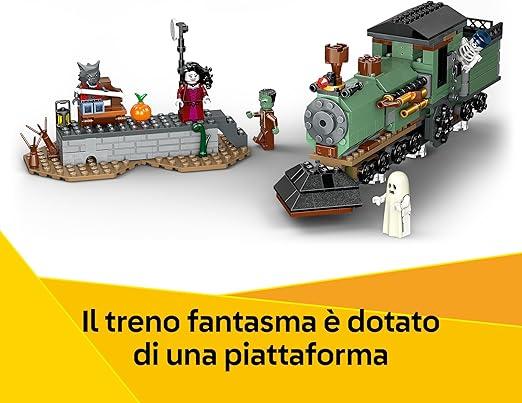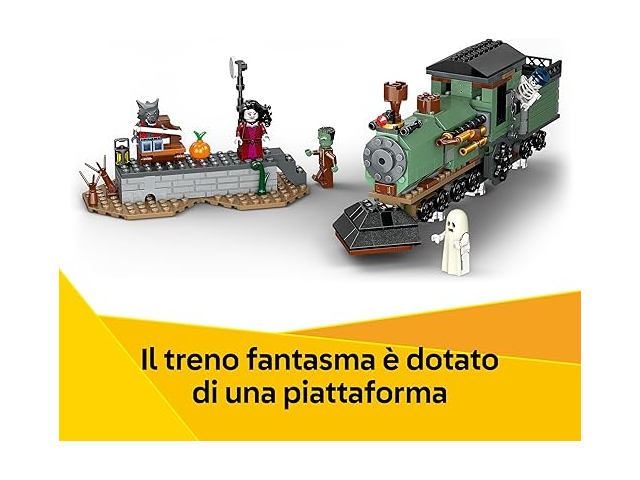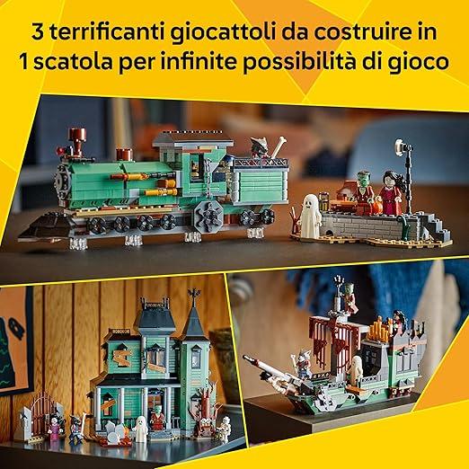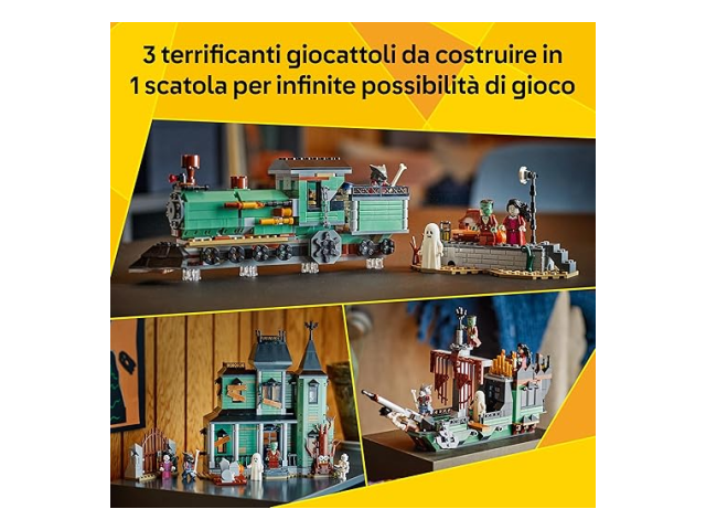 I bambini e le bambine dai 9 anni in su possono divertirsi con 3 opzioni di costruzione utilizzando gli stessi mattoncini: una casa stregata interattiva, una nave fantasma giocattolo o un treno fantasma con relativo marciapiede. Ogni set include 5 minifigure: un lupo mannaro, un vampiro, un fantasma con mantello fosforescente, il mostro di Frankenstein e uno scheletro.