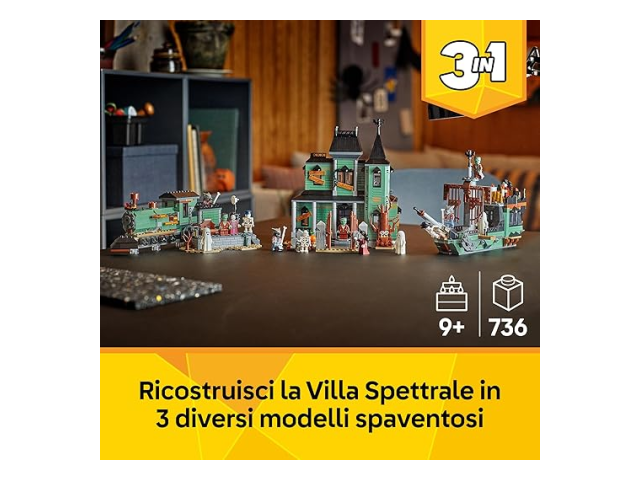 - Dimensioni: questo set LEGO® 3 in 1 di 736 pezzi include una casa stregata che misura 25 cm di altezza, 24 cm di larghezza e 15 cm di profondità