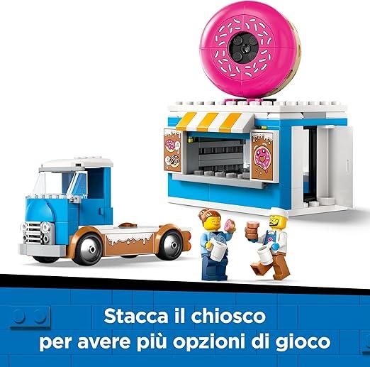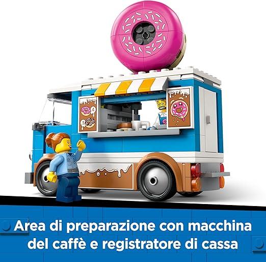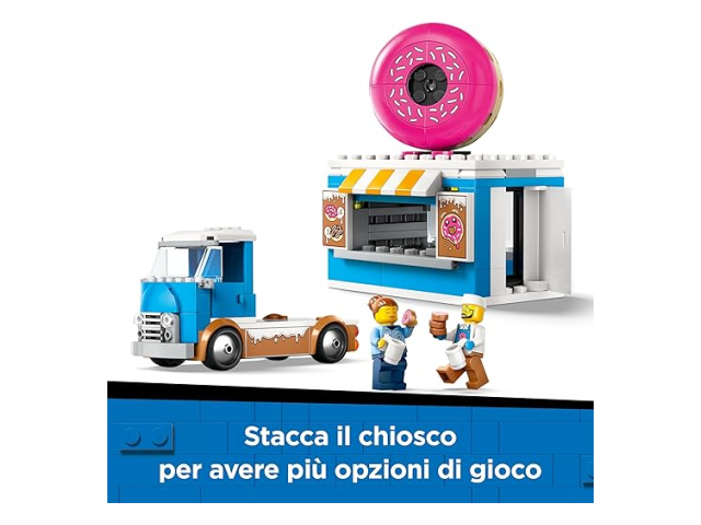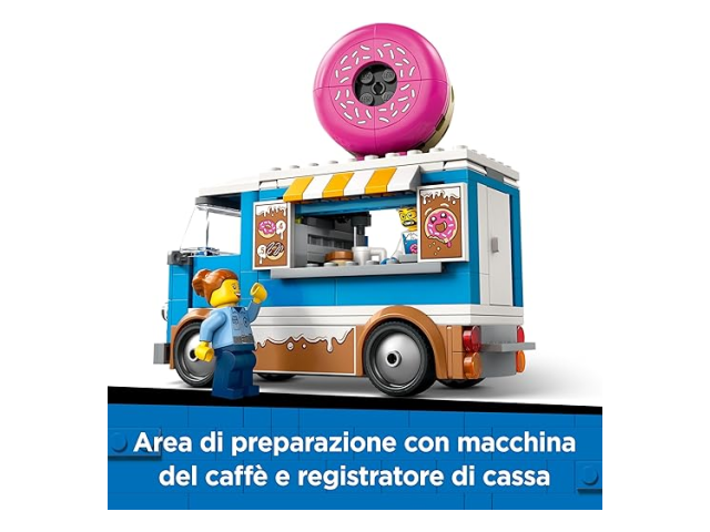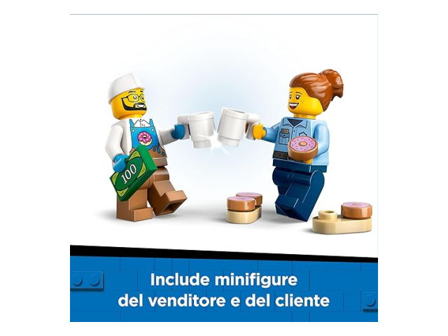 Ti presentiamo il veicolo giocattolo definitivo per gli appassionati dei dolcetti dai 5 anni in su. Il playset del Furgone delle ciambelle LEGO® City (60452) contiene una deliziosa ciambella gigante con glassa decorativa sul tetto e un’area di preparazione accessibile con macchina da caffè e registratore di cassa. I bambini possono servire gustose ciambelle e bevande dallo sportello di servizio e staccare il chiosco per ulteriori opzioni di gioco. Basta aggiungere le minifigure del venditore e del cliente per avviare il divertimento.