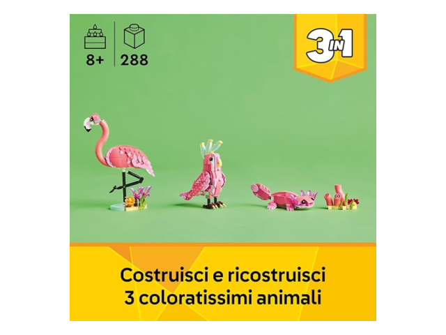- 3 opzioni di costruzione di animali selvatici in 1 scatola: il set 3 in 1 Animali selvatici: fenicottero rosa LEGO® Creator consente ai bambini dagli 8 anni in su di costruire e ricostruire 3 diversi animali con gli stessi mattoncini