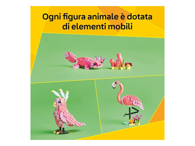 - Infinite opzioni di gioco: i bambini possono inventare storie con 3 diversi modelli di animali (notare che i modelli non possono essere costruiti contemporaneamente): un fenicottero rosa, un cacatua rosa o un axolotl rosa